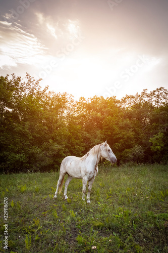Obraz premium White horse in the meadow against the evening sun.