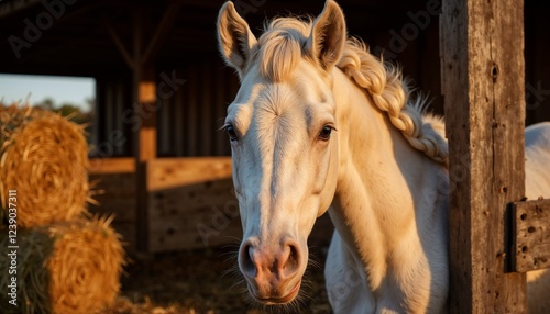 © Olesia, Obraz premium White horse peering out from stable beside hay bales