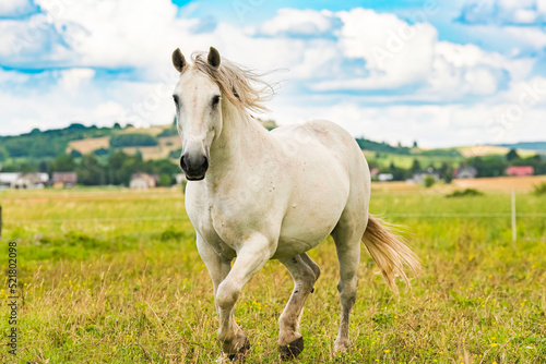 © Przemyslaw Iciak, Obraz premium White horse running on green meadow. Horse stud theme