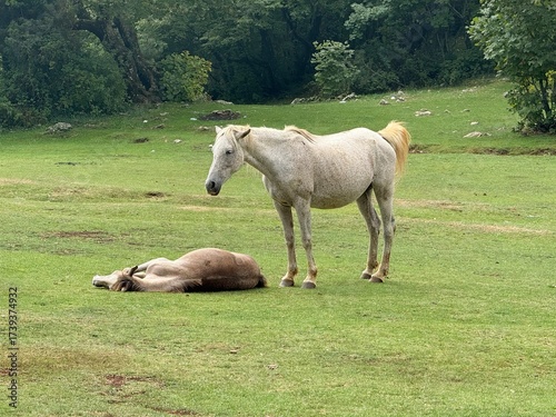 © BG_Illustrations, Obraz premium White horse standing near resting brown foal meadow