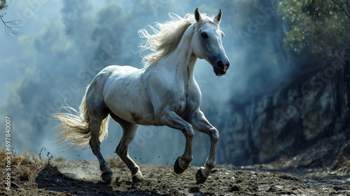 Obraz premium White horse with long mane running in foggy forest. Side view. Beautiful...