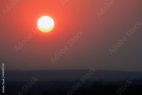 © okyela, Fototapeta premium White hot sun and red sky at sunset.
