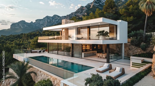 © Crazy Dark Queen, Fototapeta premium White house with a pool, surrounded by trees, under a cloudy sky