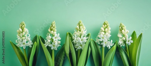 © DigitalDruid, Obraz premium White hyacinth flowers arranged in a row against a mint green background with ample copy space for text insertion.