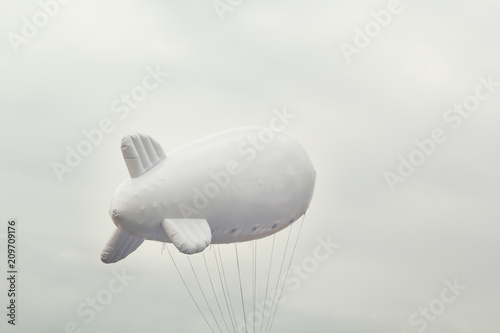 © alexey_arz, Fototapeta premium White inflatable dirigible with a place for a logo on a background of a gray sky with clouds. Copy space