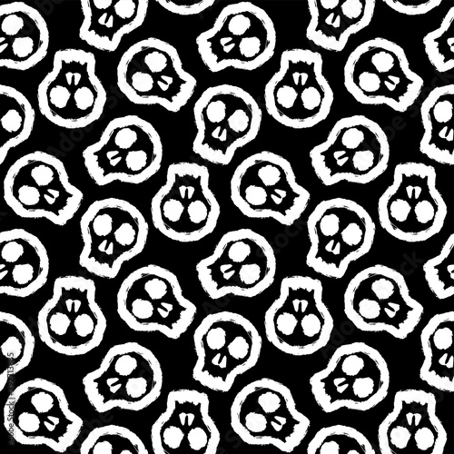 © far700, Obraz premium White ink skulls isolated on black background. Monochrome seamless pattern. Vector flat graphic hand drawn illustration. Texture.