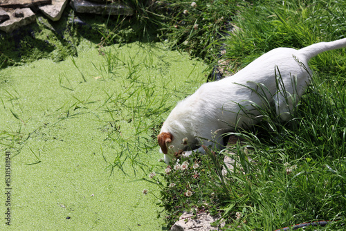 Obraz premium White Jack Russell Terrier on the edge of a pond with green algae