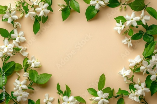 Naklejka premium White Jasmine Flowers and Green Leaves on a Cream Background