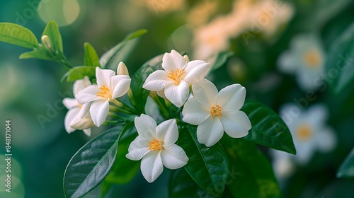 © Noppakun, Fototapeta premium White Jasmine Flowers with Green Leaves
