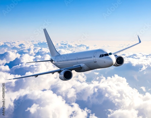 © Adista, Obraz premium White jet plane in fluffy clouds