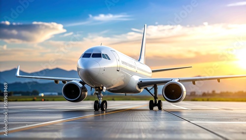 © Malihah, Obraz premium White jetliner on tarmac at sunset