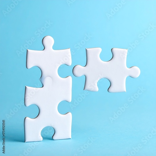 © mahanta, Obraz premium White jigsaw puzzle pieces connecting on a blue background, symbolizing teamwork, problem-solving, and finding a solution