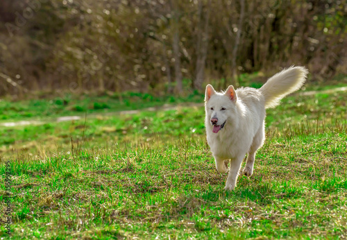 Fototapeta premium White joyful beautiful fluffy swiss shepherd dog runs on green grass