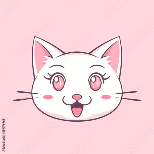 Obraz premium White kawaii cat's head on pink background. Vector cute animal character.