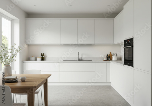 Fototapeta premium White kitchen with wooden table and chairs.