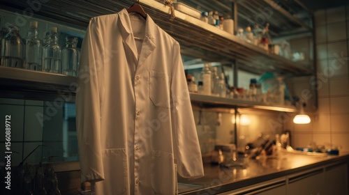 © Jane Kelly, Fototapeta premium White lab coat hanging in research facility