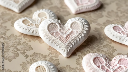Obraz premium White Lace Heart Cookies on Floral Cream Paper Valentine's Day Theme