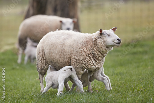 © erwin, Obraz premium White lamb drinks milk on ewe