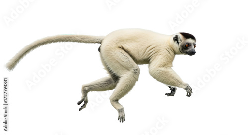 © Sanrecent, Fototapeta premium White lemur with black markings leaping between trees against a white background.