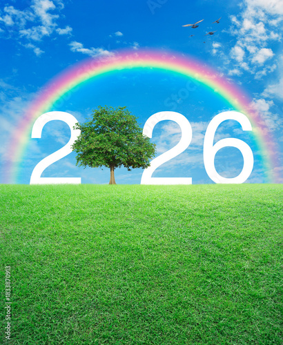 Obraz premium 2026 white letter with tree on green grass field over rainbow, birds and blue sky with white clouds, Happy new year 2026 ecological concept