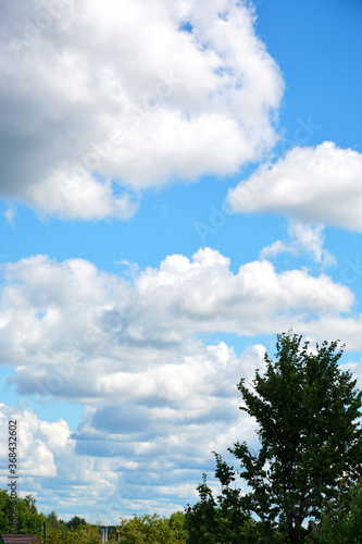 Obraz premium White light clouds float across the blue sky above the treetops. Beautiful...