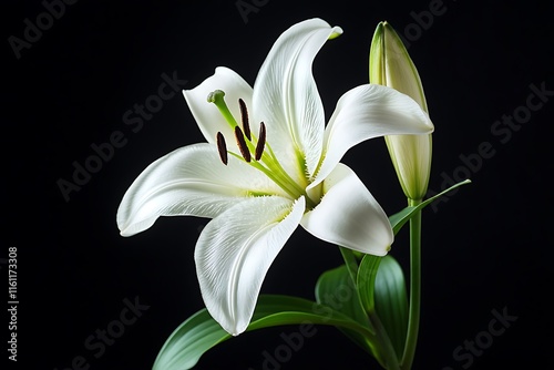 © MdArshed, Obraz premium White lily flower with green leaves isolated on black background