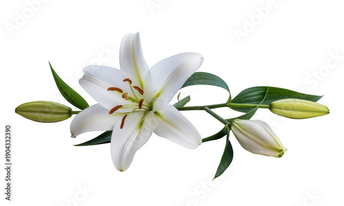 © Kamrul, Fototapeta premium White lily flower with green leaves plant isolated on a transparent background