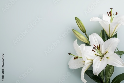 © oksa_studio, Fototapeta premium White lily flowers blooming with green buds, creating a serene floral border on a soft pastel background with ample copy space