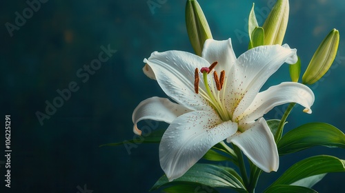 Fototapeta premium White lily with delicate petals and vibrant golden pollen, radiating beauty