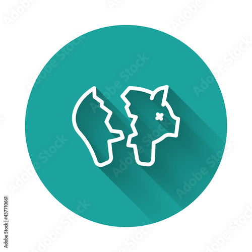 Fototapeta premium White line Broken piggy bank icon isolated with long shadow background. Icon saving or accumulation of money, investment. Green circle button. Vector
