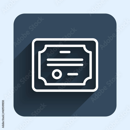 Obraz premium White line Certificate template icon isolated with long shadow background. Achievement, award, degree, grant, diploma concepts. Blue square button. Vector