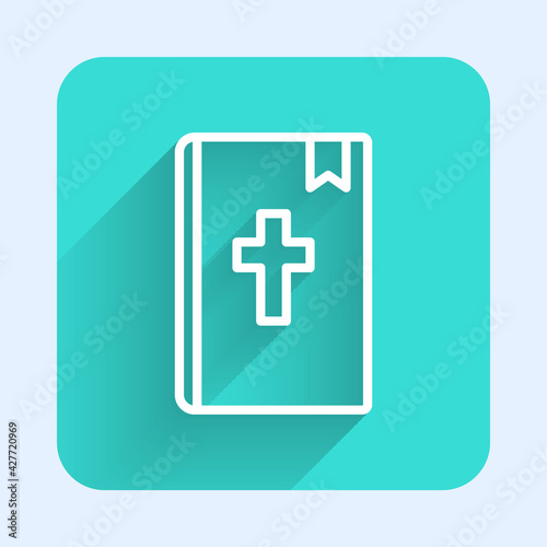 Fototapeta premium White line Holy bible book icon isolated with long shadow. Green square...