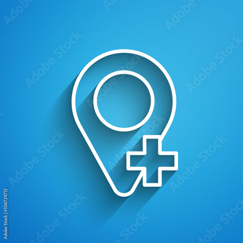 Fototapeta premium White line Map pin icon isolated on blue background. Navigation, pointer, location, map, gps, direction, place, compass, search concept. Long shadow. Vector