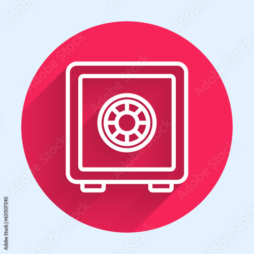 © Vadim, Fototapeta premium White line Safe icon isolated with long shadow background. The door safe a bank vault with a combination lock. Reliable Data Protection. Red circle button. Vector