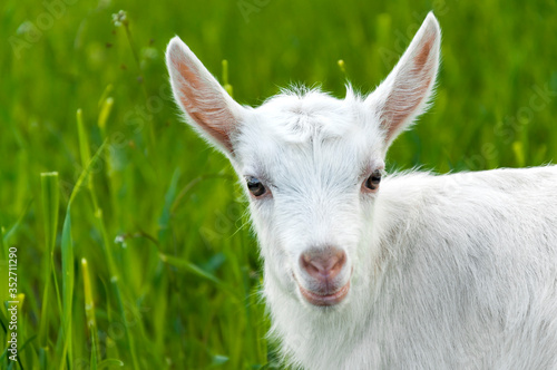 © Yuliya Kiyko, Fototapeta premium White little goat in green grass looks into the frame. Portrait animal.