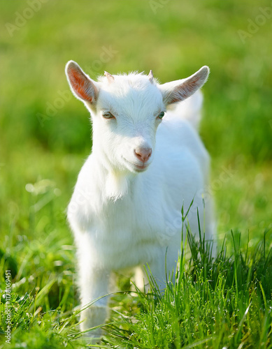 Fototapeta premium White little goat in sunny green meadow. Farm animal.