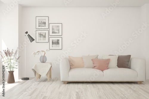Obraz premium White living room with sofa. Scandinavian interior design. 3D illustration