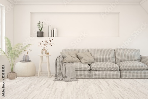 Obraz premium White living room with sofa. Scandinavian interior design. 3D illustration
