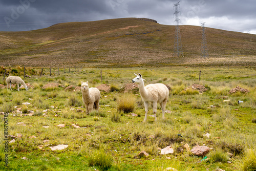 © daboost, Naklejka premium White Llama and Alpacas in the Peruvian Plain
