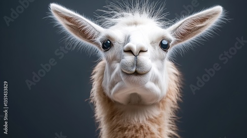 © Nataliia_Trushchenko, Naklejka premium White llama with brown spots is staring at the camera. The image has a playful and lighthearted mood, as the llama appears to be posing for the camera