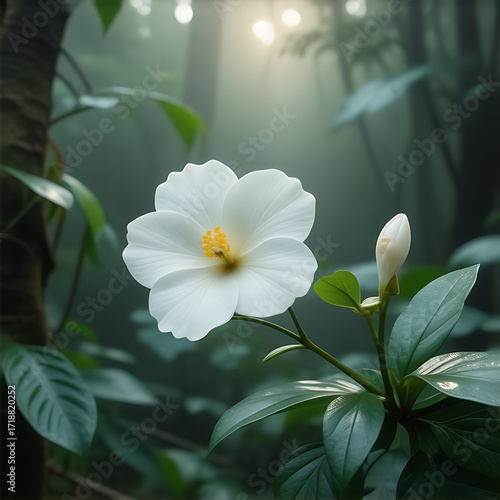 © MAZLAN, Obraz premium White Lotus Flower in Misty Jungle Setting with Green Leaves and Soft Backlight