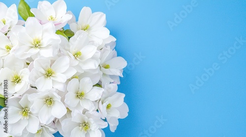 © BROPRADANA, Fototapeta premium White magnolia blossoms on blue background; spring floral arrangement; greeting card design