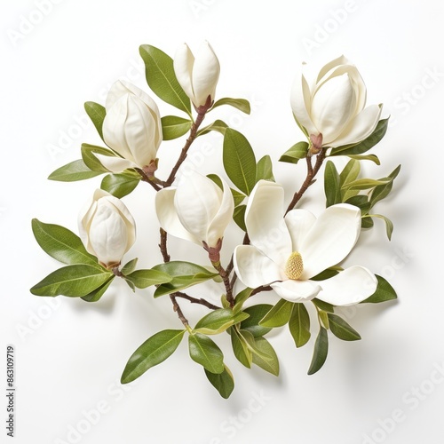 © rajun, Fototapeta premium White magnolia flowers and buds with green leaves