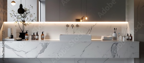 Fototapeta premium White marble bathroom vanity in a sleek modern home, minimalist design, contemporary decor, elegant surfaces, stylish interior, functional space, chic elements, bright atmosphere.