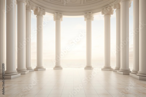 Naklejka premium White marble columns forming a circular structure overlooking a serene vast...