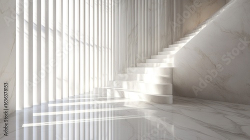 © Gisel, Obraz premium White marble staircase interior with bright sunlight filtering through vertical blinds