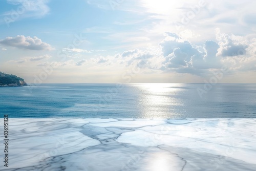 Obraz premium White marble table with sky and sea background for product display.