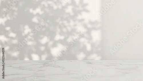 Fototapeta premium White marble tabletop with blurred sunlight and leaf shadows background