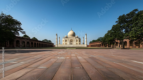 © Telrkmark, Fototapeta premium White Marble Taj Mahal Monument in Agra India Under a Clear Blue Sky