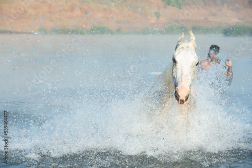 © anakondasp, Naklejka premium white Marwari horse running forward in river at early morning in frog with indian staff man behind. india. close up